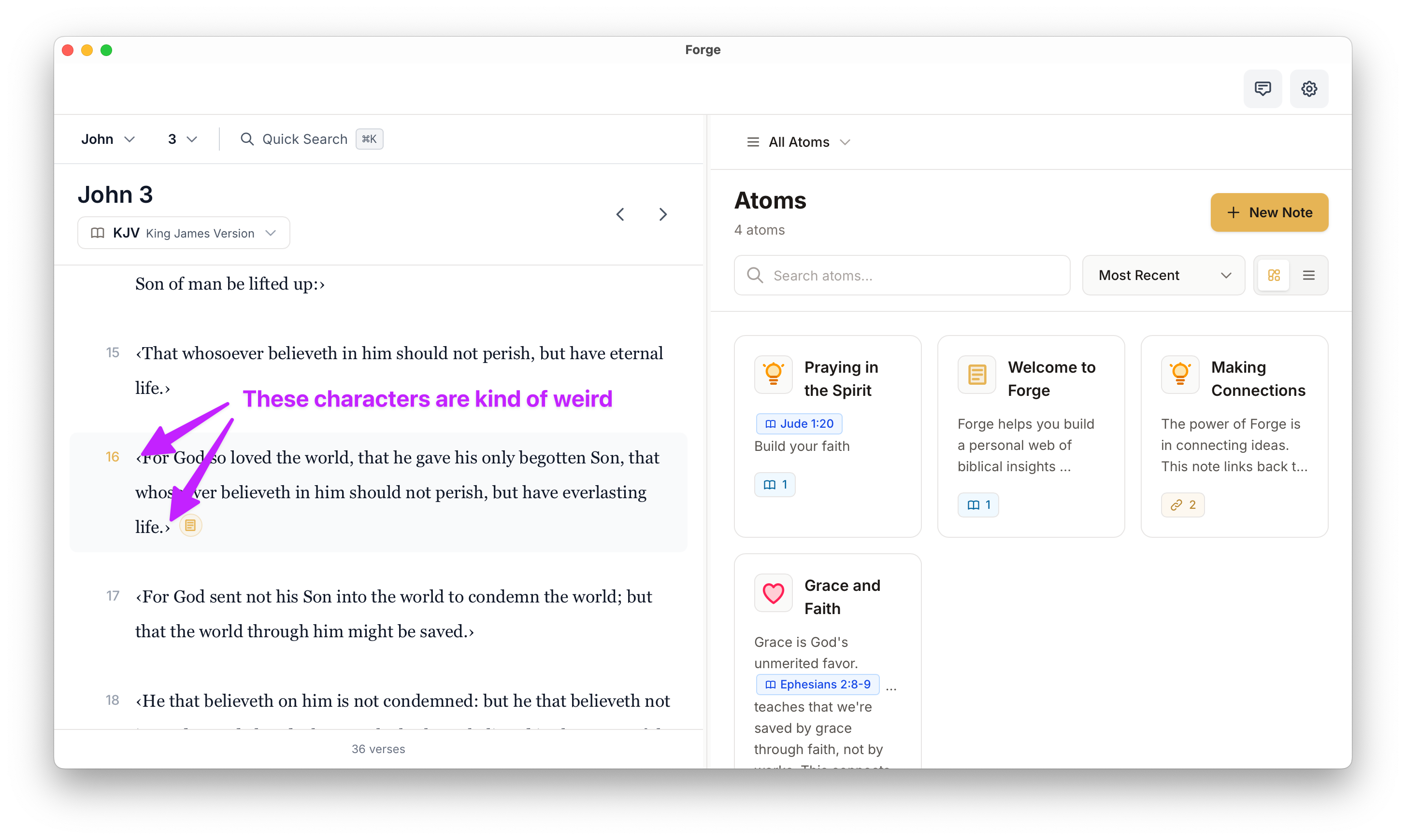 It looks like there are some strange characters (maybe for future formatting?) that denote the words of Jesus in the gospels.